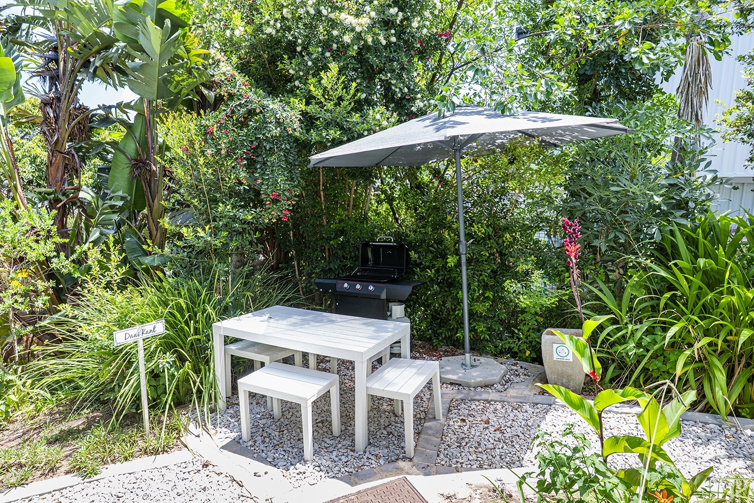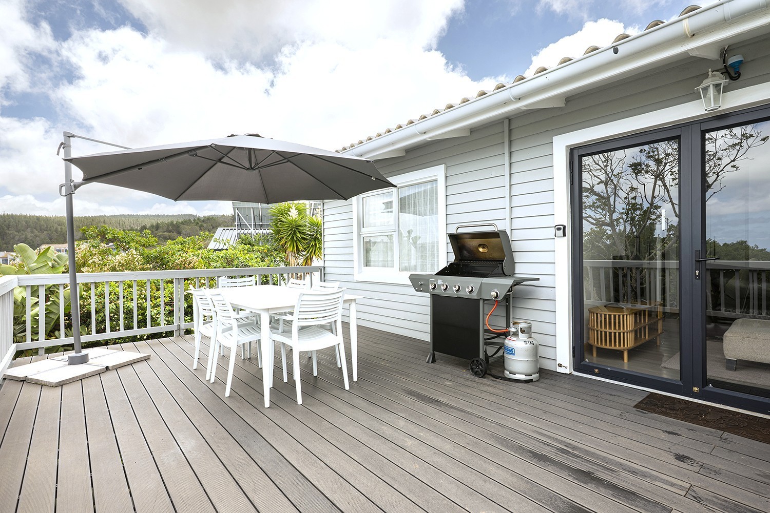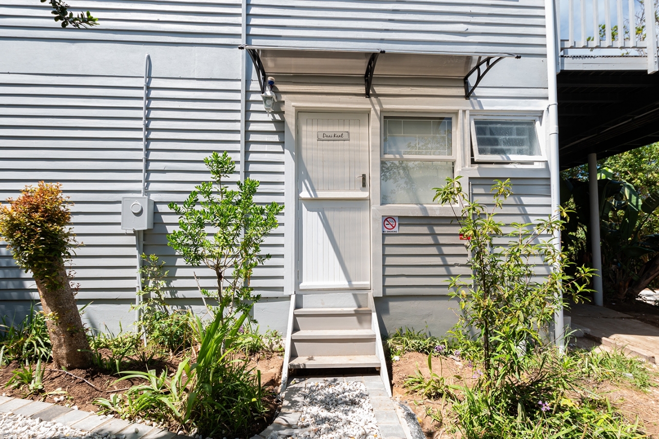 Unit 3 - BO KANT is accessible from the back of the house via a staircase leading to the wooden deck. This unit comfortably sleeps 6 guests, with each room furnished with queen size hospitality beds. It boasts beautiful wood flooring, built-in cupboards, a bathroom with shower, toilet and basin and a spacious open-plan living-kitchen area, a lovely wooden deck that offers stunning sunset views and glimpses of the distant ocean.